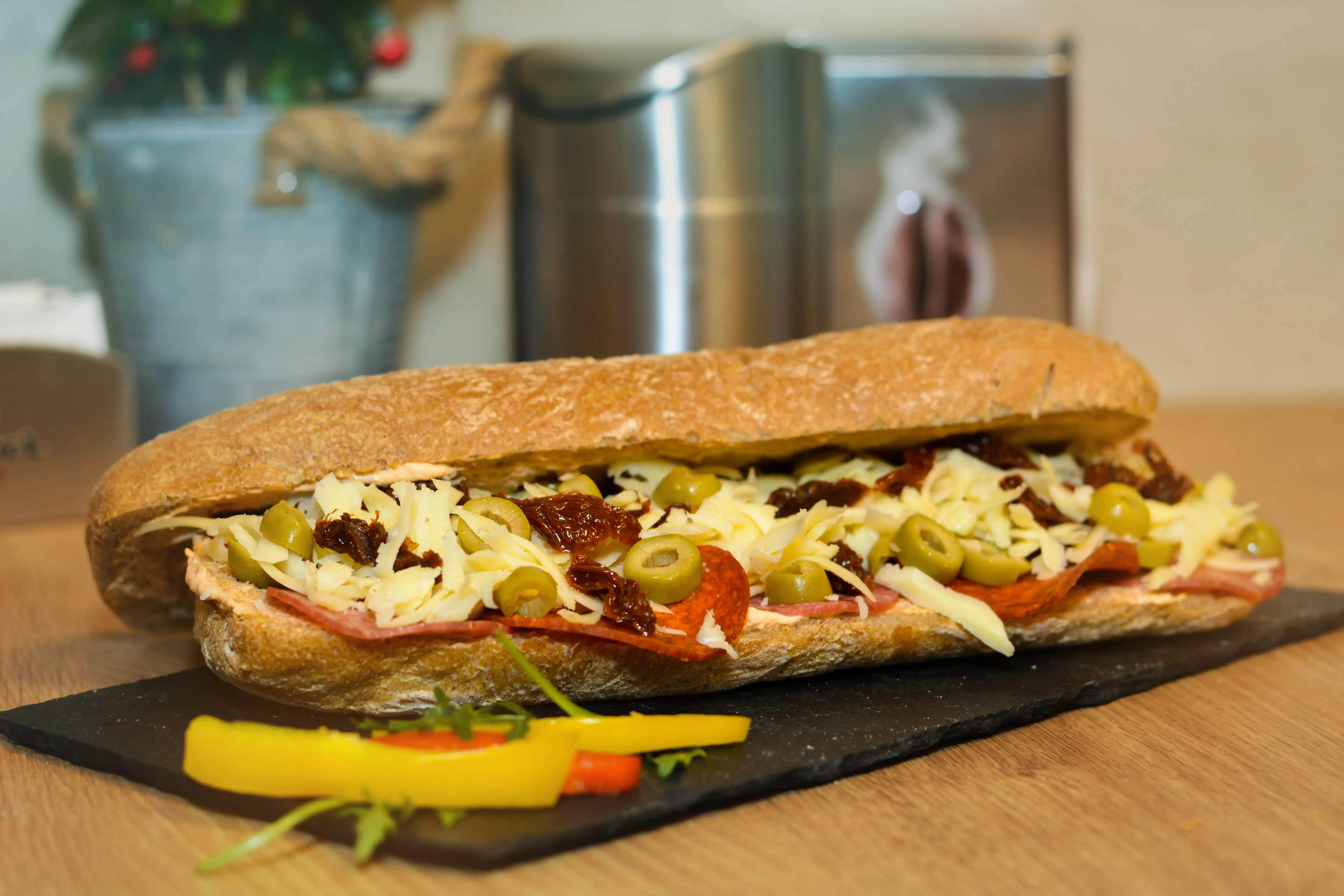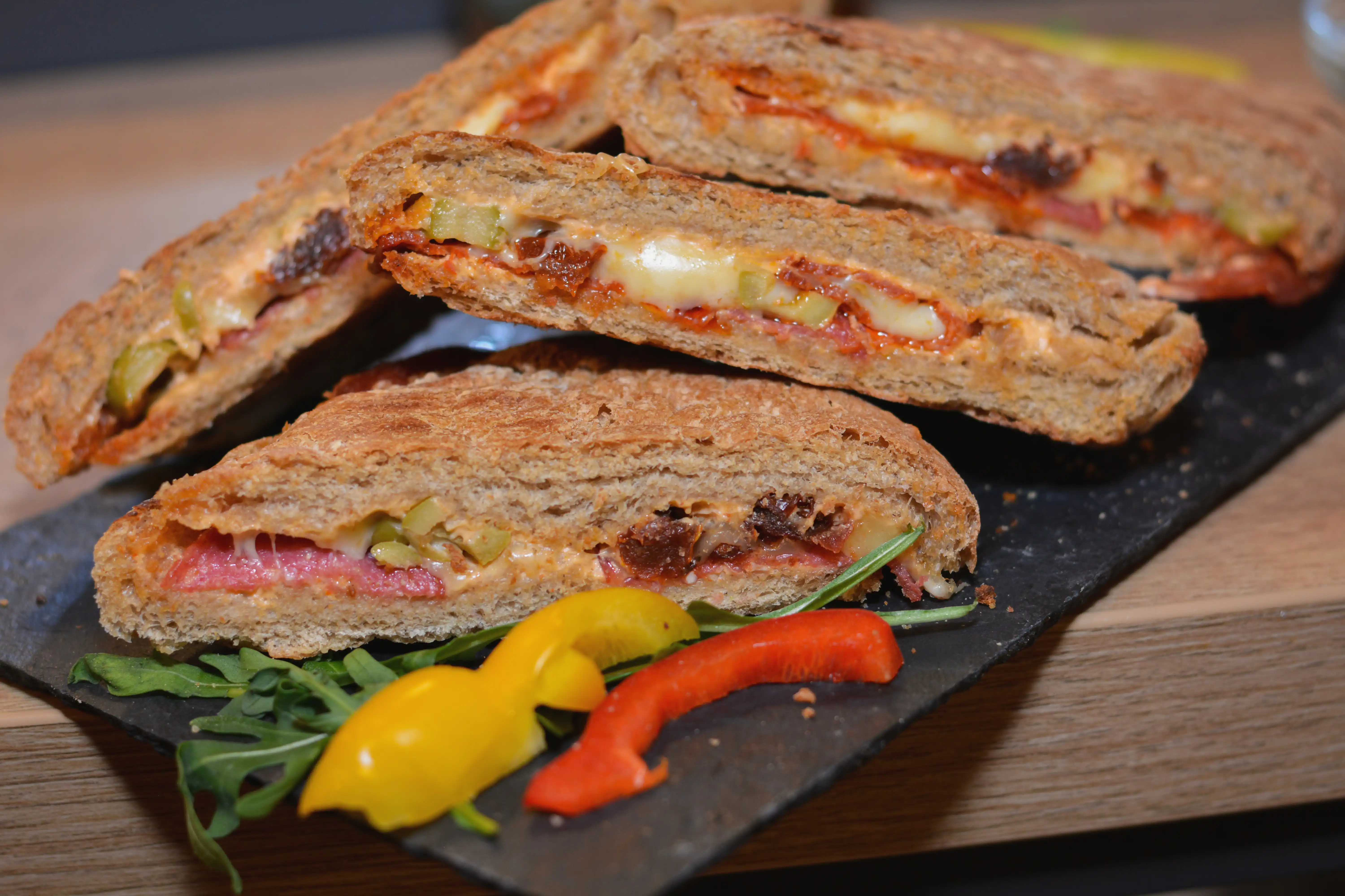 csemege szalámi, paprikás szalámi, olíva bogyó, paradicsom, sajt, vörös pesto